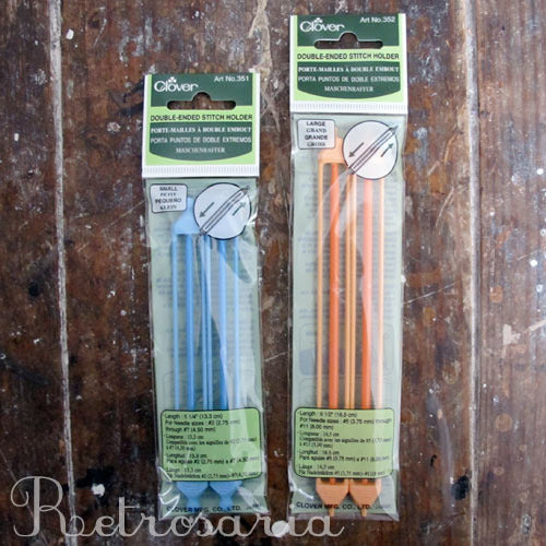Double Ended Stitch Holders by Clover, for securely holding work in progress stitches while focusing on other project sections. Simply remove the end cap and slip active stitches onto the central pin and replace the end cap. When you are ready to resume work, your safely held stitches can easily be retrieved from either side of the stitch holder regardless of the direction they were threaded from. Available in two lengths, each pack includes two identical stitch holders.