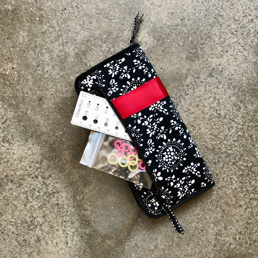 ChiaoGoo Double Point Sock Set: This sock-sized set includes six sets of 6” (15 cm), surgical stainless steel double points in sizes 0 (2.0 mm), 1 (2.25 mm), 1.5 (2.5 mm), 2 (2.75 mm), 2.5 (3.0 mm) & 3 (3.25 mm), 12 stitch markers, a 5” (13 cm) needle gauge, and a compact, zipper-enclosed fabric case with outside zippered pocket.
