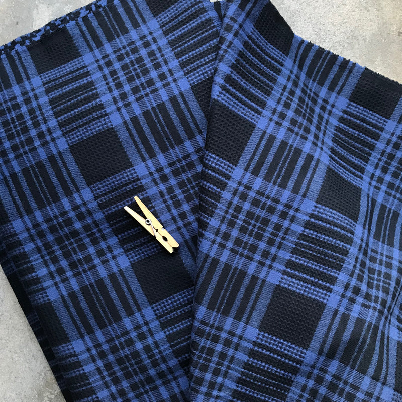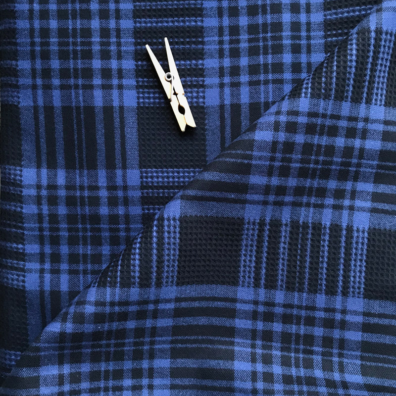High quality Portuguese fabric in a blue and black plaid print and waffle details. Medium weight fabric suitable for winter clothing such as shirts, pants and skirts.