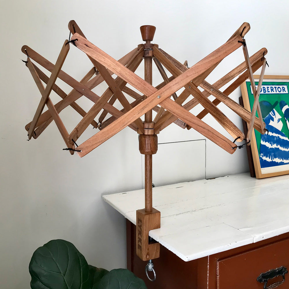 Adjustable umbrella swift, to transform skeins into ready-to-use yarn balls. It can be attached to a table or another support surface. Available in acacia or mango wood.