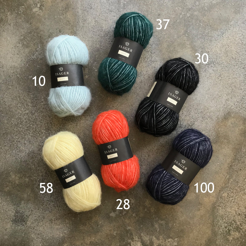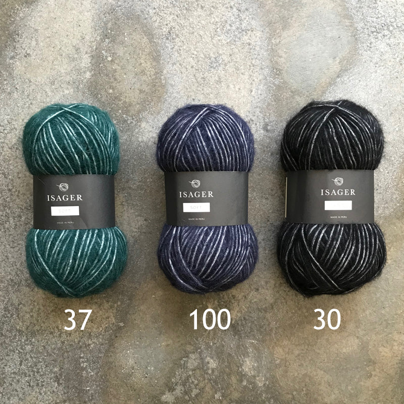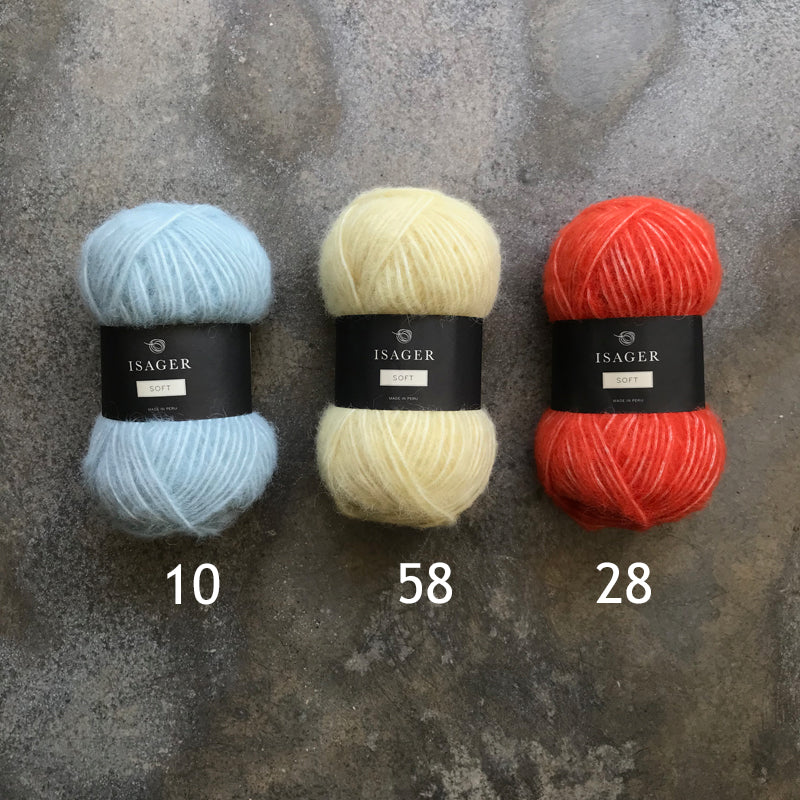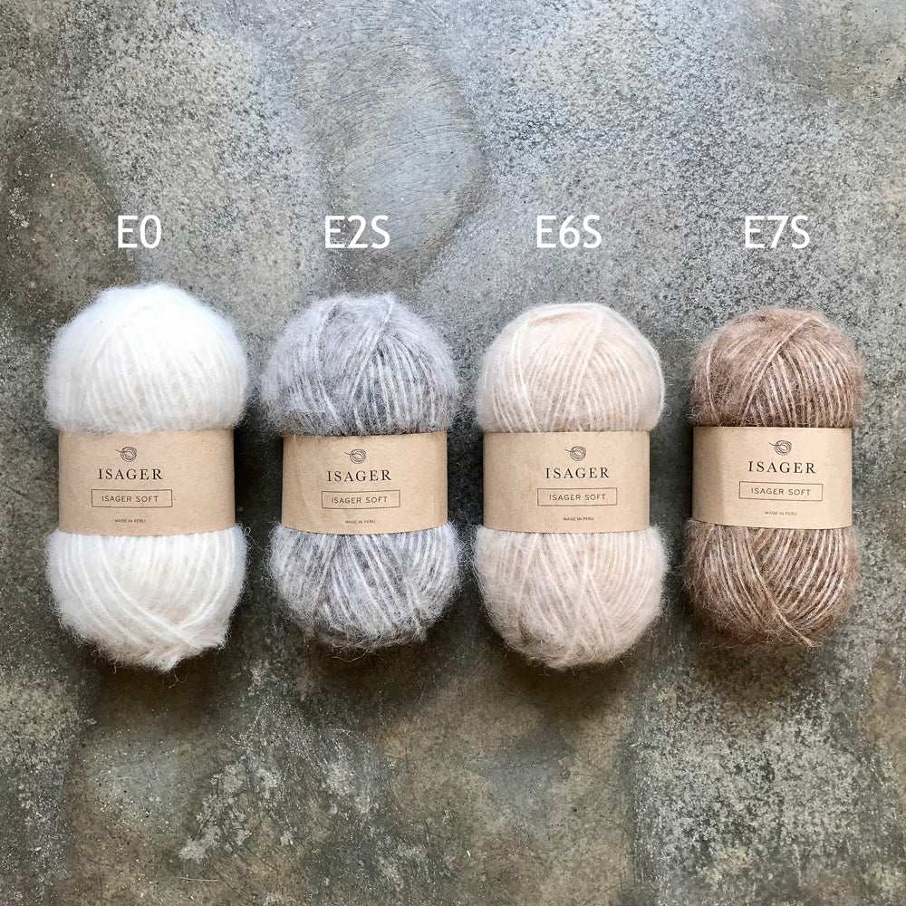 A soft, warm and fluffy yarn, Isager Soft can replace the yarn in patterns for sweaters knitted with Silk Mohair held together with another yarn. Some knitters prefer to knit with one strand only but would still like the fluffy structure, and this look is obtained with Soft.
