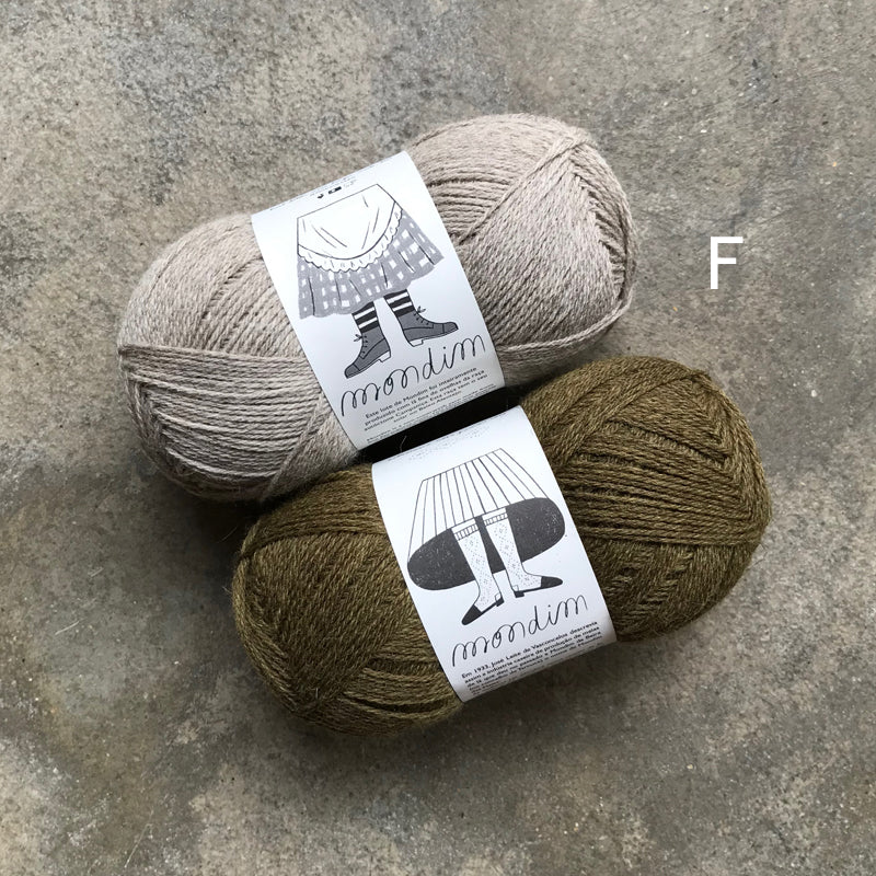 - 1 (1, 1, 1) 1, 1, 1 (1, 1, 2) skeins (depending on size) of Mondim or La Bien Aimée Mondim in CC, depending on color choice.