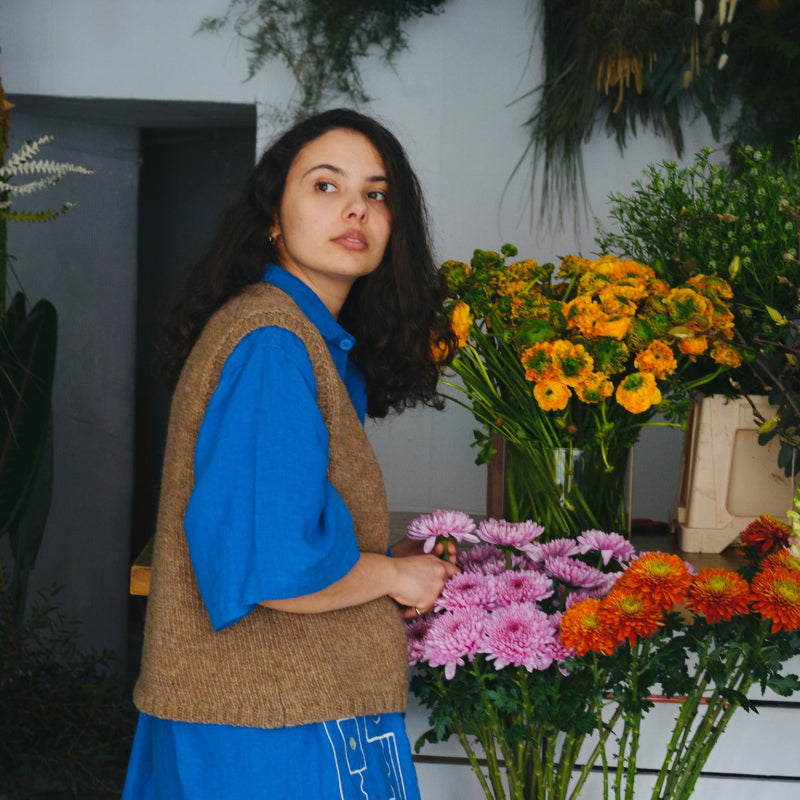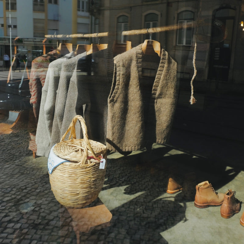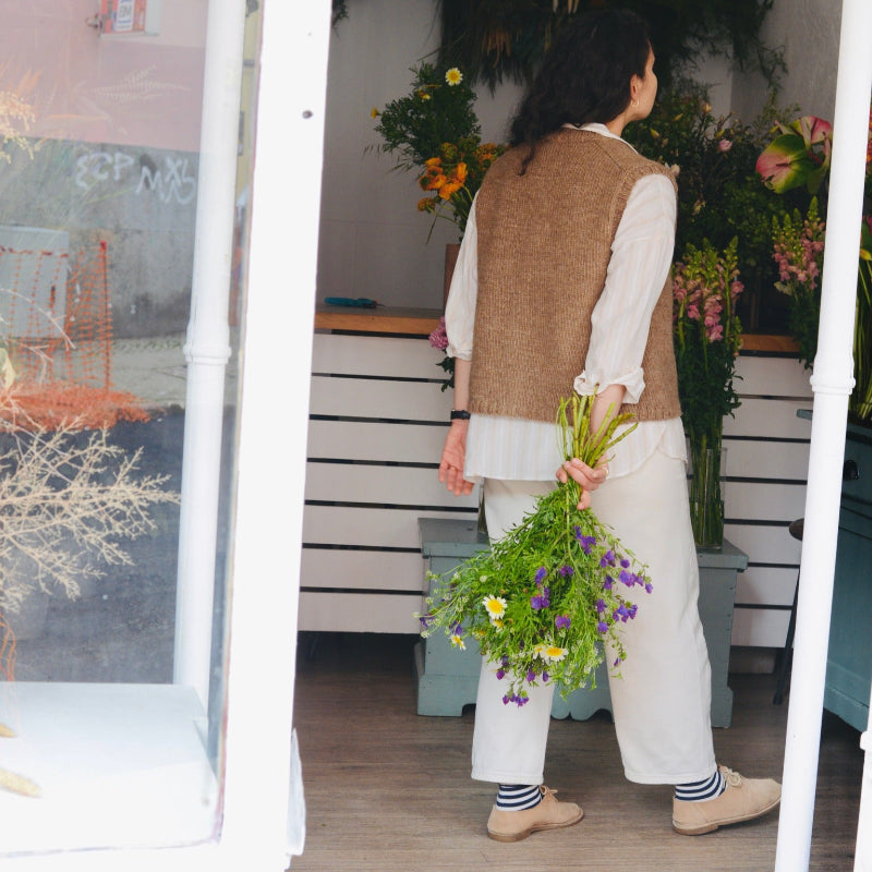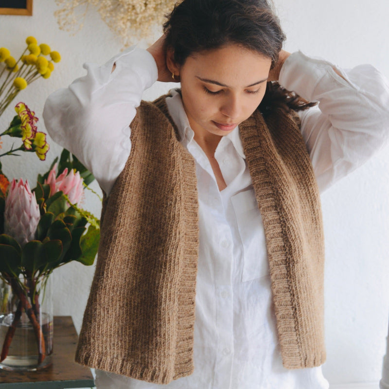 This is a v-neck open vest with ribbed details. It is made from our Badana yarn, a rustic single-ply woolly yarn, produced from the wool of the Churra Badana - a beautiful red-faced, long wool sheep native to the northeastern region of Portugal, and the third most endangered of our native breeds. This wool produces a light fabric that is very warm and insulating.