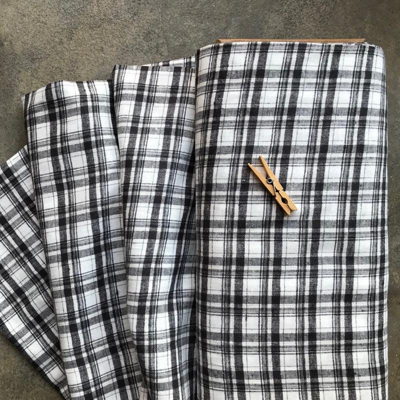 High quality Portuguese plaid linen, in tones of black and white. Medium weight fabric suitable for making shirts, pants and other garments.