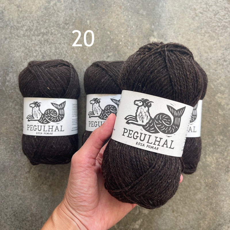 Pegulhal is a fingering weight yarn for knitters who like non superwash wooly yarns, dyed in the wool and ideal for stranded knitting projects. It is made from different native Portuguese wools. Our most recent batch is made with Campaniça and Black Merino.