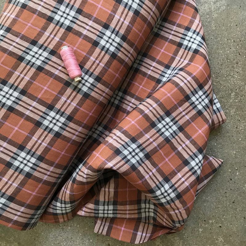 High quality Portuguese fabric, in a checked print in tones of dark grey, white, pink and terracotta. Lightweight linen fabric suitable for shirts, skirts and dresses.