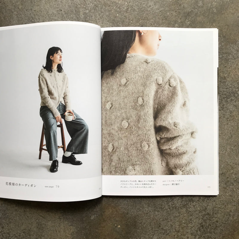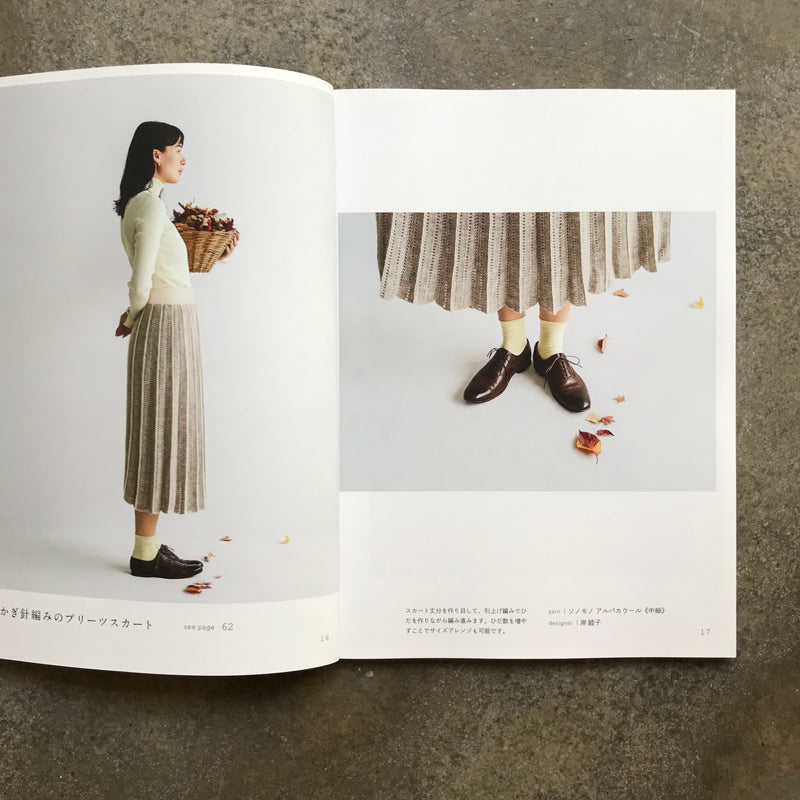 Japanese book featuring a collection of knitting and crochet garments worked with undyed yarn, which allows you to enjoy its natural color and texture. Features 19 designs ranging from beginner-friendly items such as seamless cardigans and straight-knit vests, to more challenging knitting items such as guernsey sweaters, Aran vests, and crocheted pleated skirts.