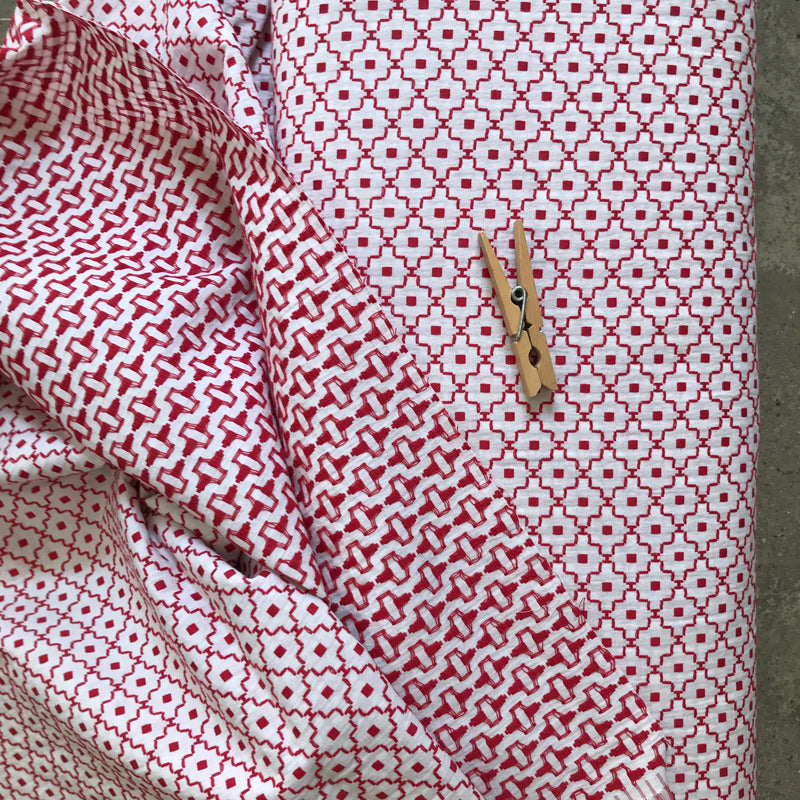 High quality Portuguese fabric, double-sided with geometric motifs in red over white. Lightweight cotton suitable for summer clothes such as shirts, skirts and dresses.