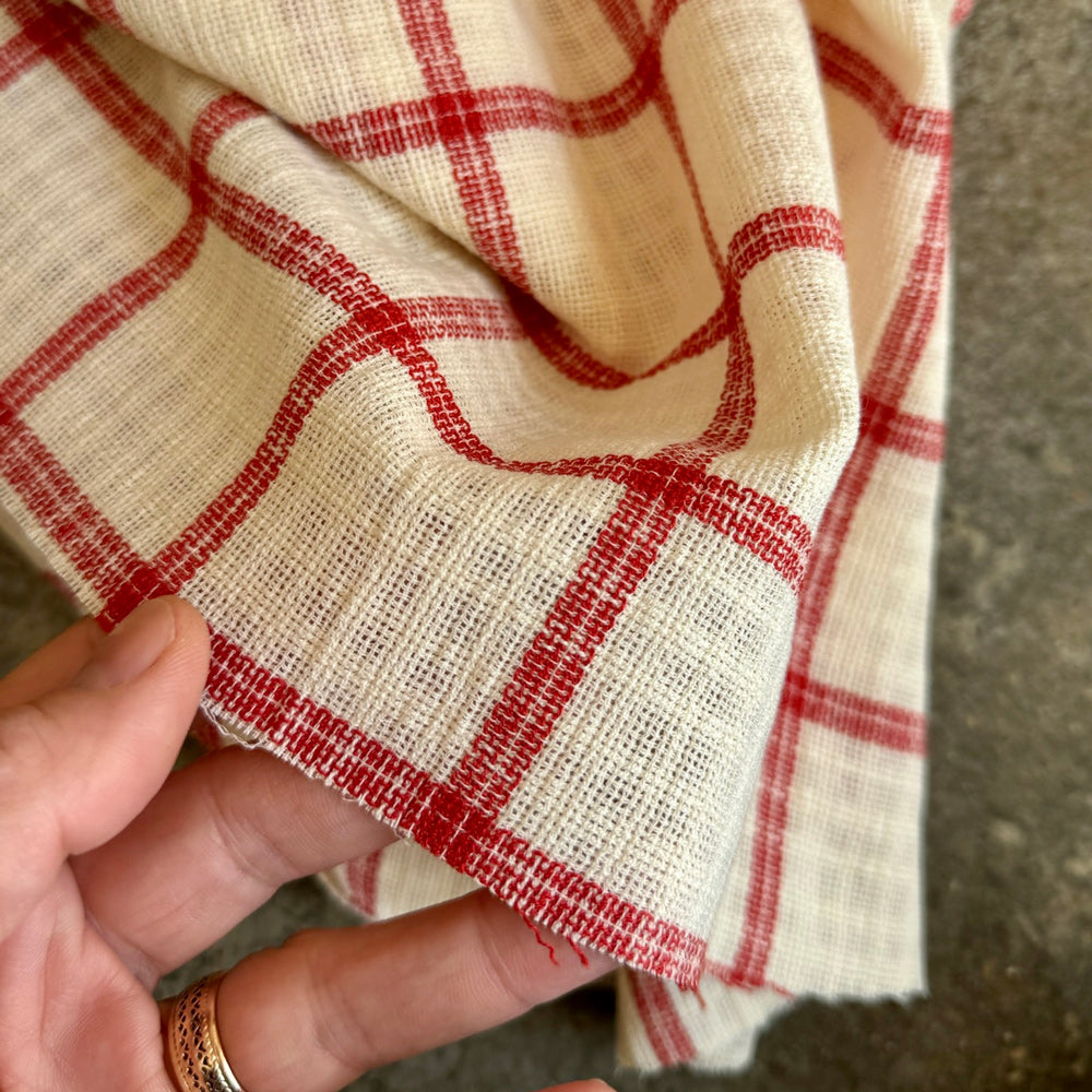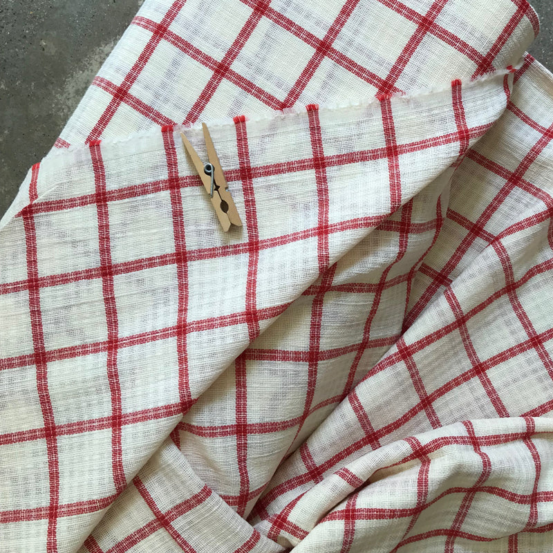 Tecido português de alta qualidade, com padrão axadrezado vermelho sobre fundo branco. Tecido leve muito adequado à confecção de camisas, saias e vestidos.