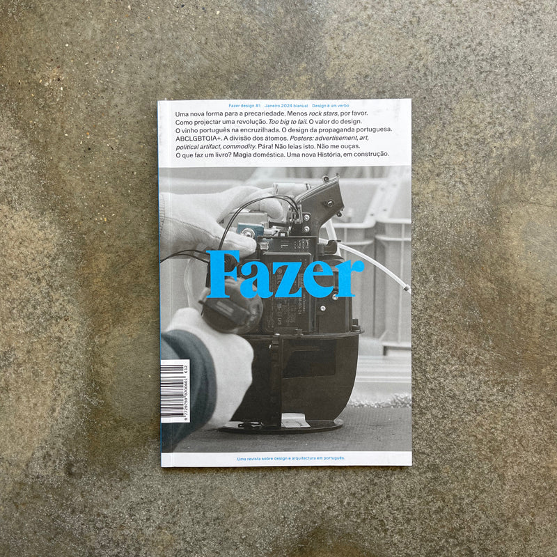 Primeira edição da revista Fazer. Criada e lançada em 2023, a Fazer pretende ser a principal revista de design em língua portuguesa. Dirigida pelos críticos e curadores de design Frederico Duarte e Vera Sacchetti, tem como objetivo mapear os territórios da agência de design através das vozes daqueles que a moldam em Portugal e no estrangeiro. Pretende abordar como as disciplinas do projecto interagem contínua e decisivamente com a tecnologia, o trabalho, o consumo ou o exercício da política, na língua portuguesa.