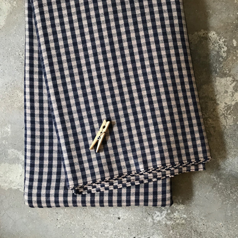 Tecido português de alta qualidade, indicado para a confecção de vestuário. Flanela leve com padrão xadrez em azul escuro e bege, ideal para camisas.