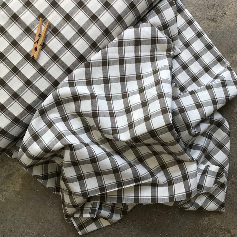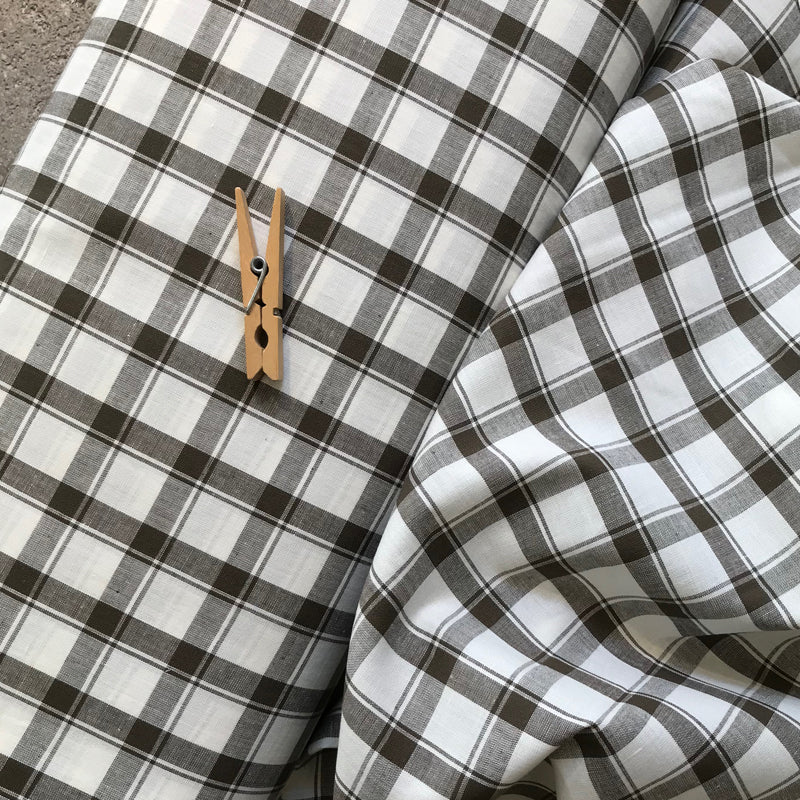 Tecido português de alta qualidade, em xadrez branco e cinza. Tecido leve de mistura de algodão e linho, indicado para a confecção de camisas, saias e vestidos.