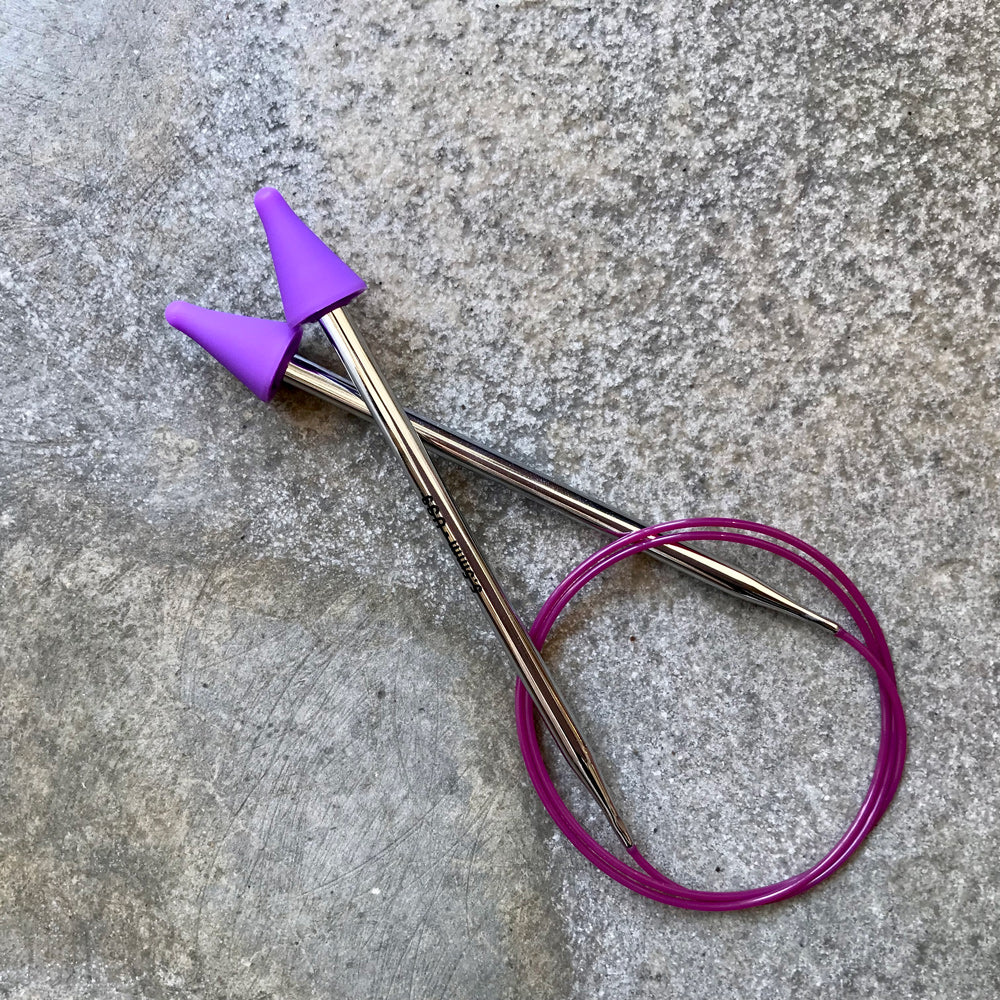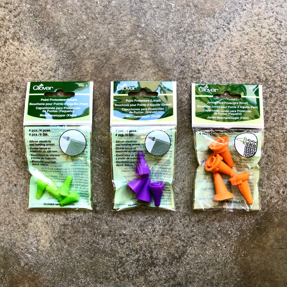 Ponteiras protectoras em borracha para evitar que as malhas caiam das agulhas de tricot quando se pousa o trabalho. Cada embalagem contém quatro ponteiras.