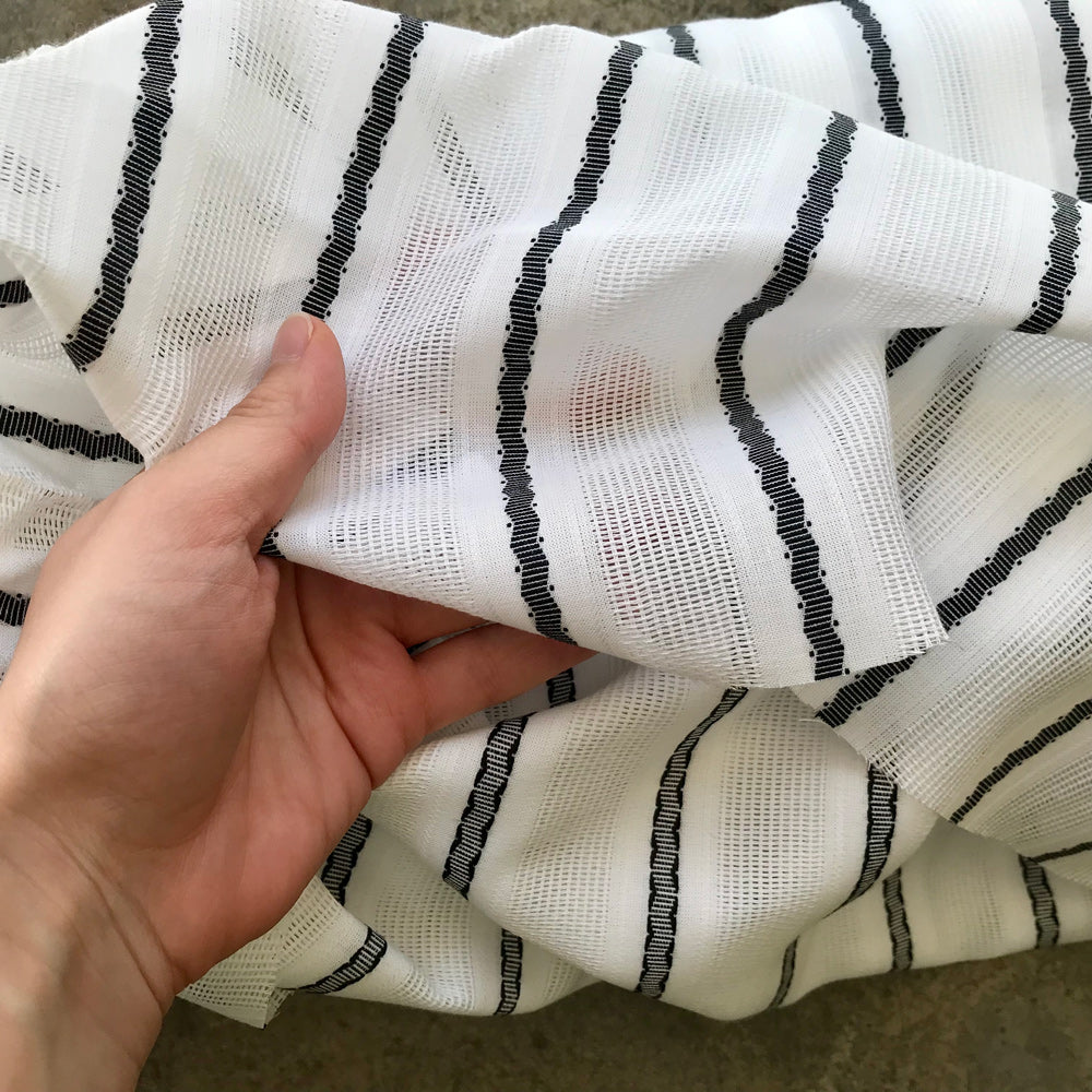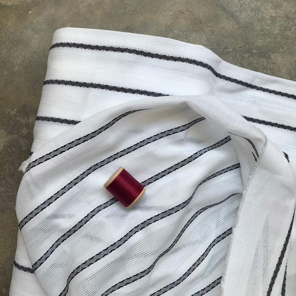 Tecido português de alta qualidade, com riscas em azul escuro e pequenos motivos sobre branco. Tecido leve de algodão, indicado para a confecção de camisas, saias e vestidos.