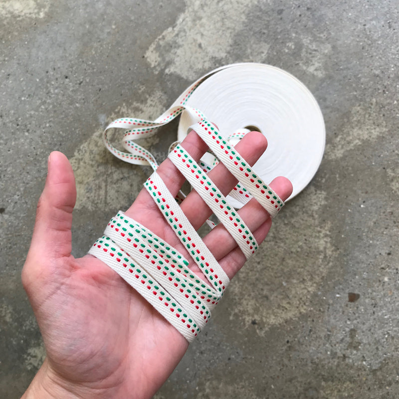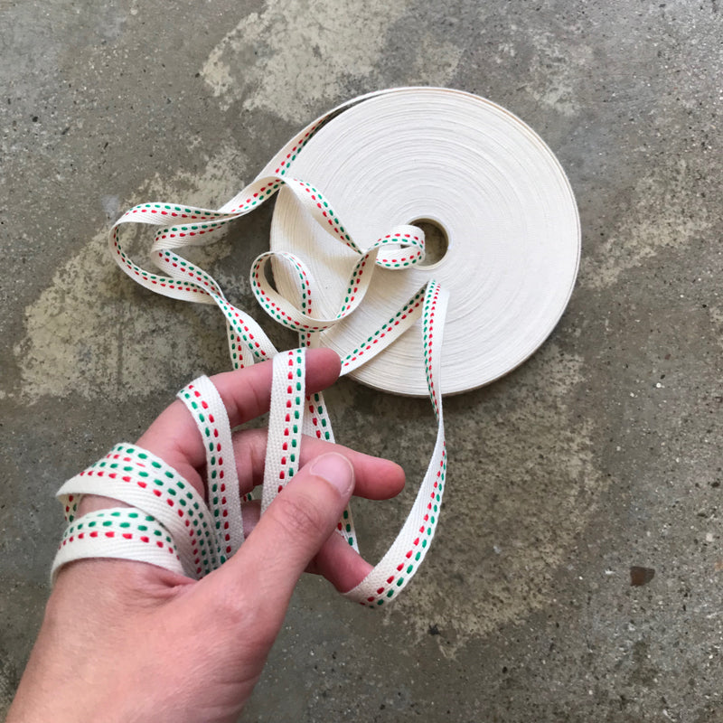 Fita sarjada reversível em algodão cru com pesponto bi-color, 10mm de largura. Para projectos de costura e detalhes decorativos.