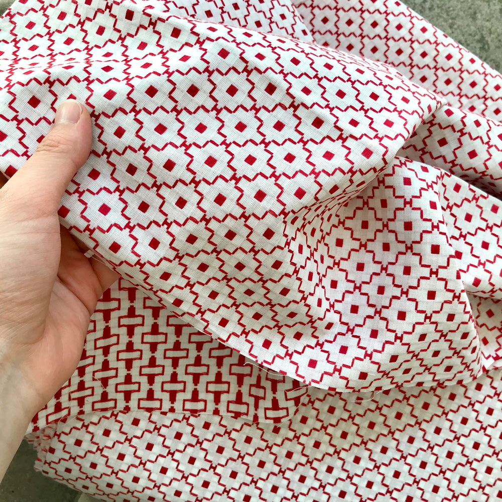 Tecido português de alta-qualidade, de dupla-face com motivos geométricos em vermelho sobre fundo branco. Tecido leve de algodão adequado à confecção de roupa leve, como camisas, saias e vestidos.